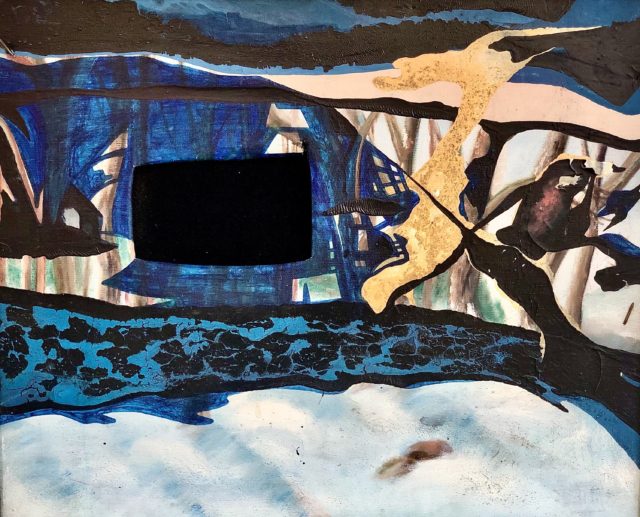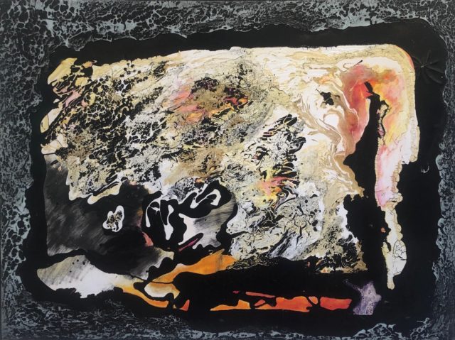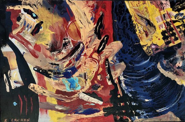 Cro-Ken considered Nature a co-collaborator in the creative process, allowing its improvisational alchemy to transform and consummate his physical investigations. Action, reaction, and improvisation with time and Nature are evident in Cro-Ken’s entire oeuvre. In addition to his paintings and writings, he engaged in time-released performances with composer, improviser, and oboist Matt Sullivan. Live and pre-recorded videos of Cro-Ken’s painting experiments were juxtaposed with Sullivan’s music, creating a multi-sensory experience for the audience. Matt Sullivan and dancer Beatrice Antonie Martino will collaborate in a performance on April 4th, honoring Cro-Ken’s love for interdisciplinary and improvisatory creation.