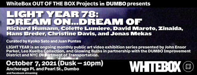LIGHT YEAR is an ongoing monthly public art video exhibition series presented by John Ensor Parker, Leo Kuelbs Collection, and Glowing Bulbs in partnership with the DUMBO Improvement Districts and NYC Department of Transportation.